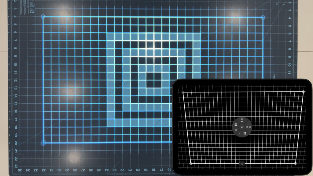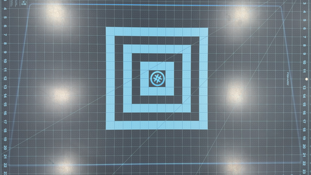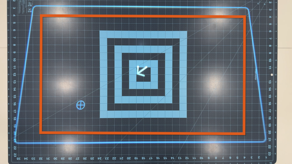 Now that your environment is setup, we will continue with the calibration. The first step is to find the largest rectangle on the cutting mat that is within the white outline. (Outlined in red).