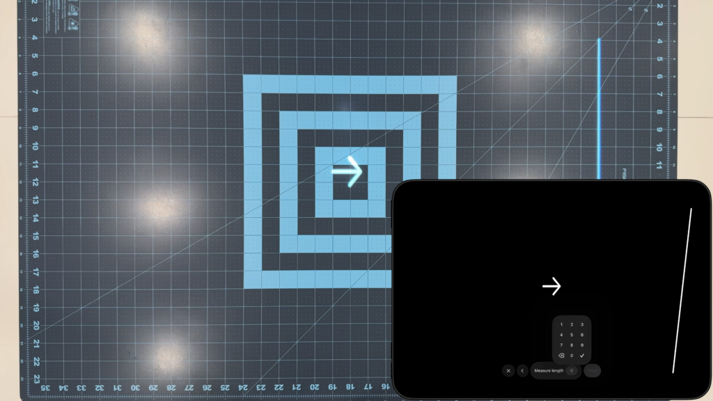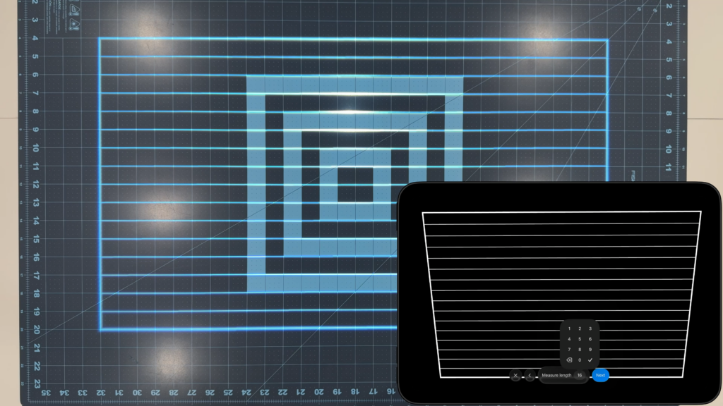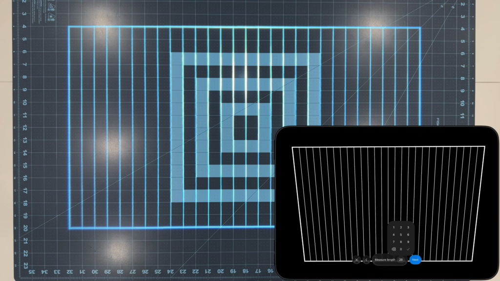 Measure the highlighted line with a tape measure or using the markings. Enter the number in the app. If the width is correct, you’ll see vertical lines that line up with the grid.